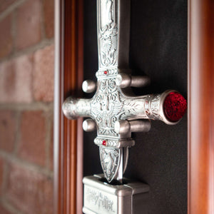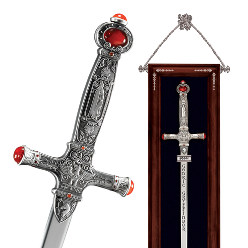 Una perfetta ricreazione della spada di Godric Grifondoro, con un manico intricatamente dettagliato con cabochon di cristallo, apposto su una bella targa di legno. Questa spada, forgiata dai goblin e intrisa di magia antica, è stata brandita da Godric Grifondoro stesso e ha giocato un ruolo cruciale nella sconfitta del Basilisco da parte di Harry Potter. Prodotto ufficiale Noble Collection. ⚡🪄🏰 #GryffindorSword #HarryPotter #WizardingWorld #Magic #GoblinCrafted